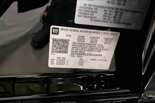 2026 GMC Sierra 1500 SLT 10-Speed Automatic, 4WD, Jet Black Leather, 10-Way Power Driver Seat Adjuster with Lumbar, 10-Way Power Passenger Seat Adjuster with Lumbar, 120-Volt Bed Mounted Power Outlet, 120-Volt Interior Power Outlet, 170 Amp Alternator, 2 Charge/Data USB Ports, 2 Charge/Data USB Ports Inside Center Console, 2 Type-C Charge-Only Rear USB Ports, 20 Polished Aluminum Wheels, 3.23 Rear Axle Ratio, 4-Wheel Disc Brakes, 6 Speakers, 6-Speaker Audio System Feature, ABS brakes, Adaptive Cruise Control, Air Conditioning, All-Weather Floor Liner, Alloy wheels, AM/FM radio: SiriusXM with 360L, Apple CarPlay/Android Auto, Auto High-beam Headlights, Auto-dimming door mirrors, Auto-dimming Rear-View mirror, Auto-Locking Rear Differential, Automatic Emergency Braking, Automatic temperature control, Auxiliary External Transmission Oil Cooler, Black Badging Package, Black GMC Emblems, Black Sierra Nameplates, Brake assist, Buckle to Drive, Bumpers: chrome, Chrome Header and Chrome Grille Insert Bars, Chrome Wheel to Wheel Assist Steps, Color-Keyed Carpeting Floor Covering, Compass, Deep-Tinted Glass, Delay-off headlights, Driver door bin, Driver Memory, Driver vanity mirror, Dual Active Exhaust, Dual front impact airbags, Dual front side impact airbags, Electric Rear-Window Defogger, Electronic Precision Shift, Electronic Stability Control, Emergency communication system: OnStar, Floor-Mounted Center Console, Following Distance Indicator, Forward Collision Alert, Front 40/20/40 Split-Bench Seat, Front and Rear Black Molded Splash Guards, Front anti-roll bar, Front Bucket Seats, Front Center Armrest w/Storage, Front dual zone A/C, Front fog lights, Front Frame-Mounted Black Recovery Hooks, Front License Plate Kit, Front Pedestrian Braking, Front Rain-Sensing Wipers, Front reading lights, Front wheel independent suspension, Fully automatic headlights, GMC Protection Package, HD Rear Vision Camera, HD Surround Vision, Heated 2nd Row Outboard Seats, Heated door mirrors, Heated Driver and Front Outboard Passenger Seating, Heated front seats, Heated steering wheel, High Capacity Suspension Package, Hitch Guidance, Hitch View, Illuminated entry, in-Vehicle Trailering System App, Integrated Trailer Brake Controller, IntelliBeam Automatic High Beam on/Off, Keyless Open and Start, Lane Keep Assist with Lane Departure Warning, LED Cargo Area Lighting, Low tire pressure warning, Manual Tilt-Wheel and Telescoping Steering Column, Memory seat, Navigation System, Occupant sensing airbag, OnStar Services Capable, Outside temperature display, Overhead airbag, Overhead console, Panic alarm, Passenger door bin, Passenger vanity mirror, Perforated Leather-Appointed Front Outboard Seat Trim, Perimeter Lighting, Power Door Locks, Power door mirrors, Power driver seat, Power Front Passenger Windows with Express Up/Down, Power Front Windows with Driver Express Up/Down, Power passenger seat, Power Rake and Telescoping Steering Column, Power Rear Windows with Express Down, Power Sliding Rear Window with Rear Defogger, Power steering, Power Sunroof, Power windows, Preferred Equipment Group 4SA, Premium Bose 7-Speaker Sound System, ProGrade Trailering System, Push Button Start, Radio data system, Radio: Premium GMC Infotainment Audio System, Rain sensing wipers, Rear Cross Traffic Braking, Rear Pedestrian Detection, Rear reading lights, Rear seat center armrest, Rear step bumper, Rear Wheelhouse Liners, Rear window defroster, Remote keyless entry, Remote Vehicle Starter System, Safety Alert Seat, Security system, Sierra Safety Plus Package, SiriusXM with 360L Trial Subscription, SLT Convenience Package, SLT Preferred Package, SLT Premium Package, Speed control, Speed-sensing steering, Split folding rear seat, Spray-on Pickup Bedliner with GMC Logo, Standard Suspension Package, Steering Wheel Audio Controls, Steering wheel mounted audio controls, Tachometer, Price includes: $1500 - Bonus Cash. Exp. 04/30/20